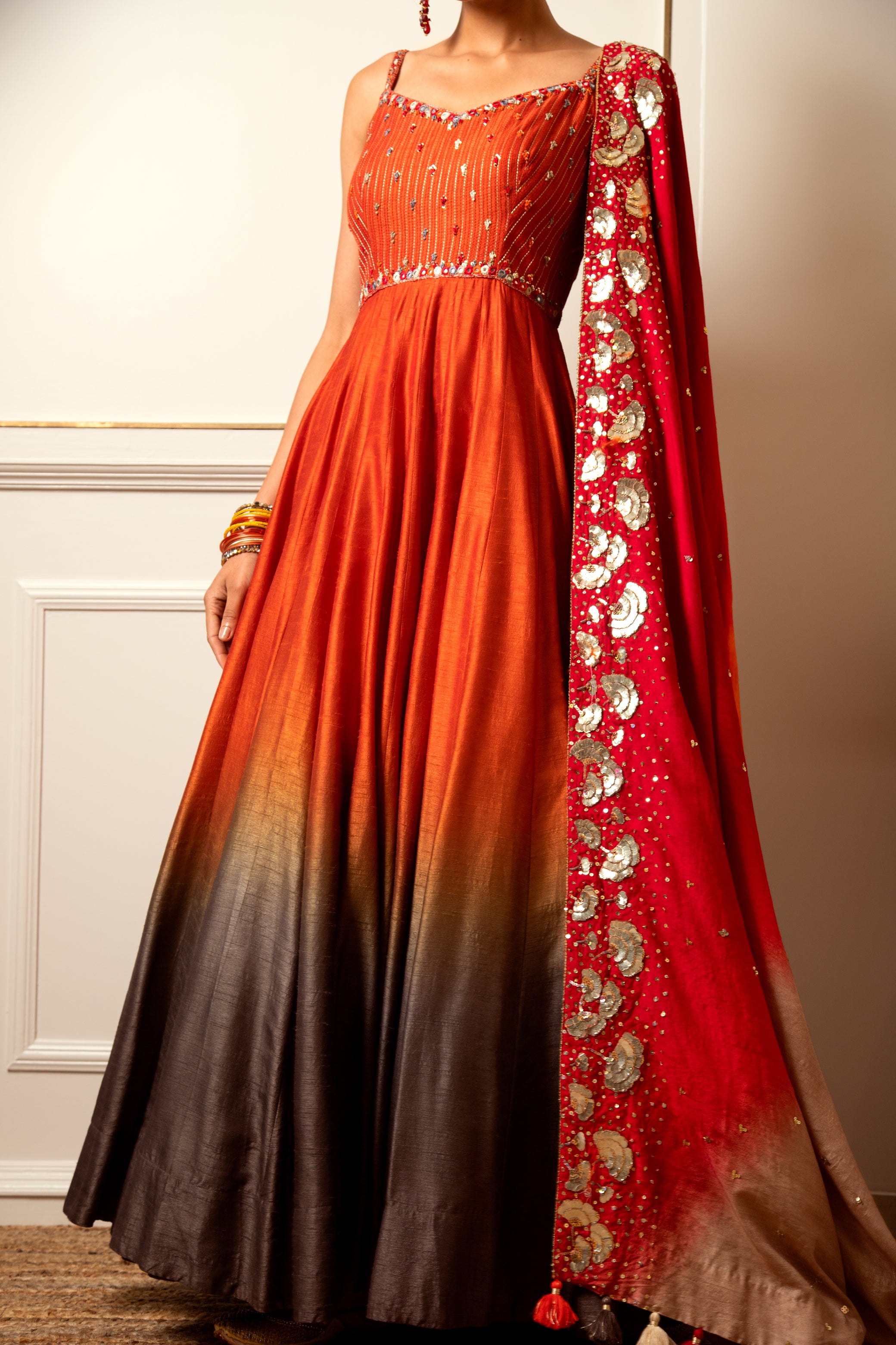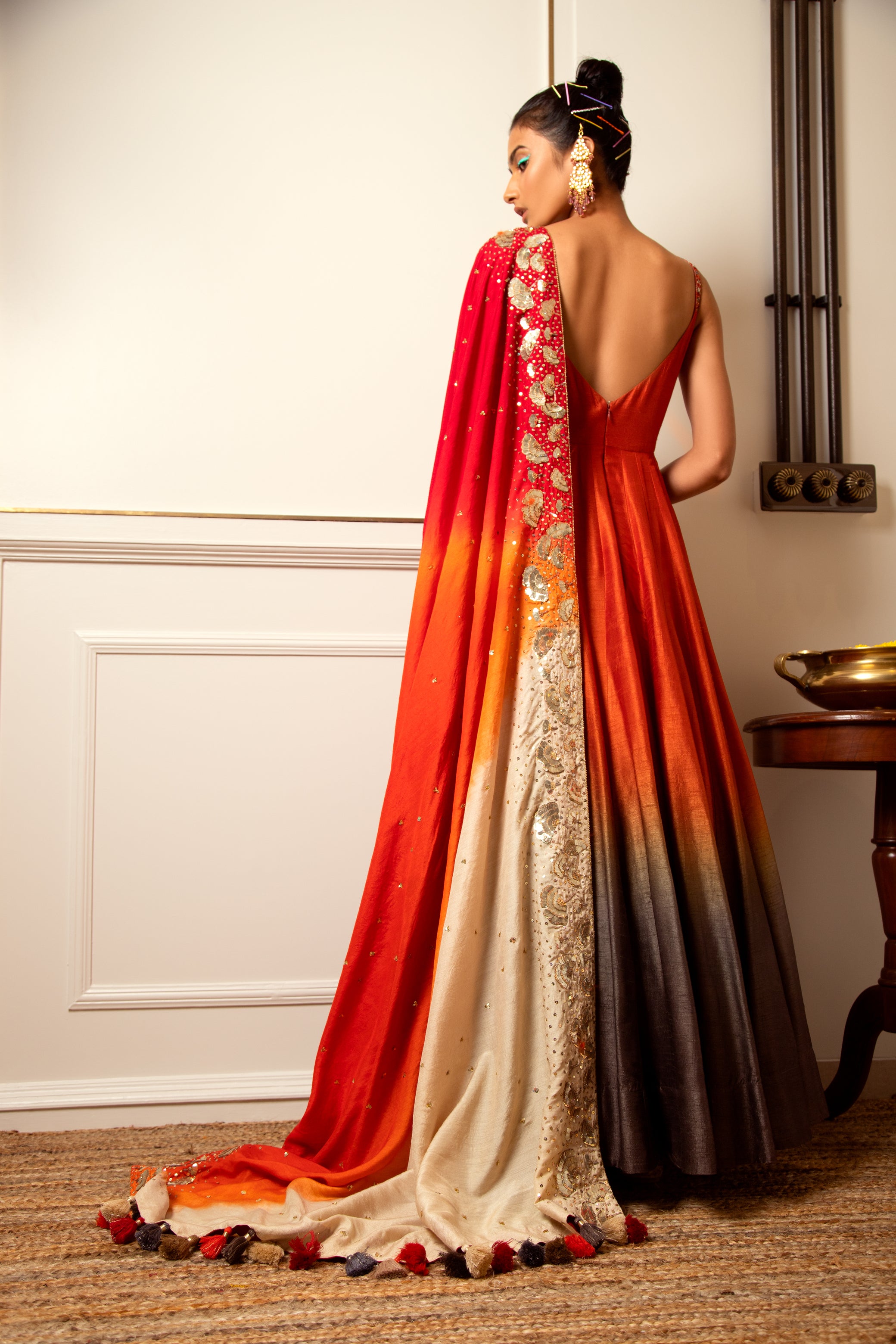 A 3D ombre dupatta in shades ruby red, bright orange & biscuit beige. It is finished with our signature hand-made colourful thread tassels.