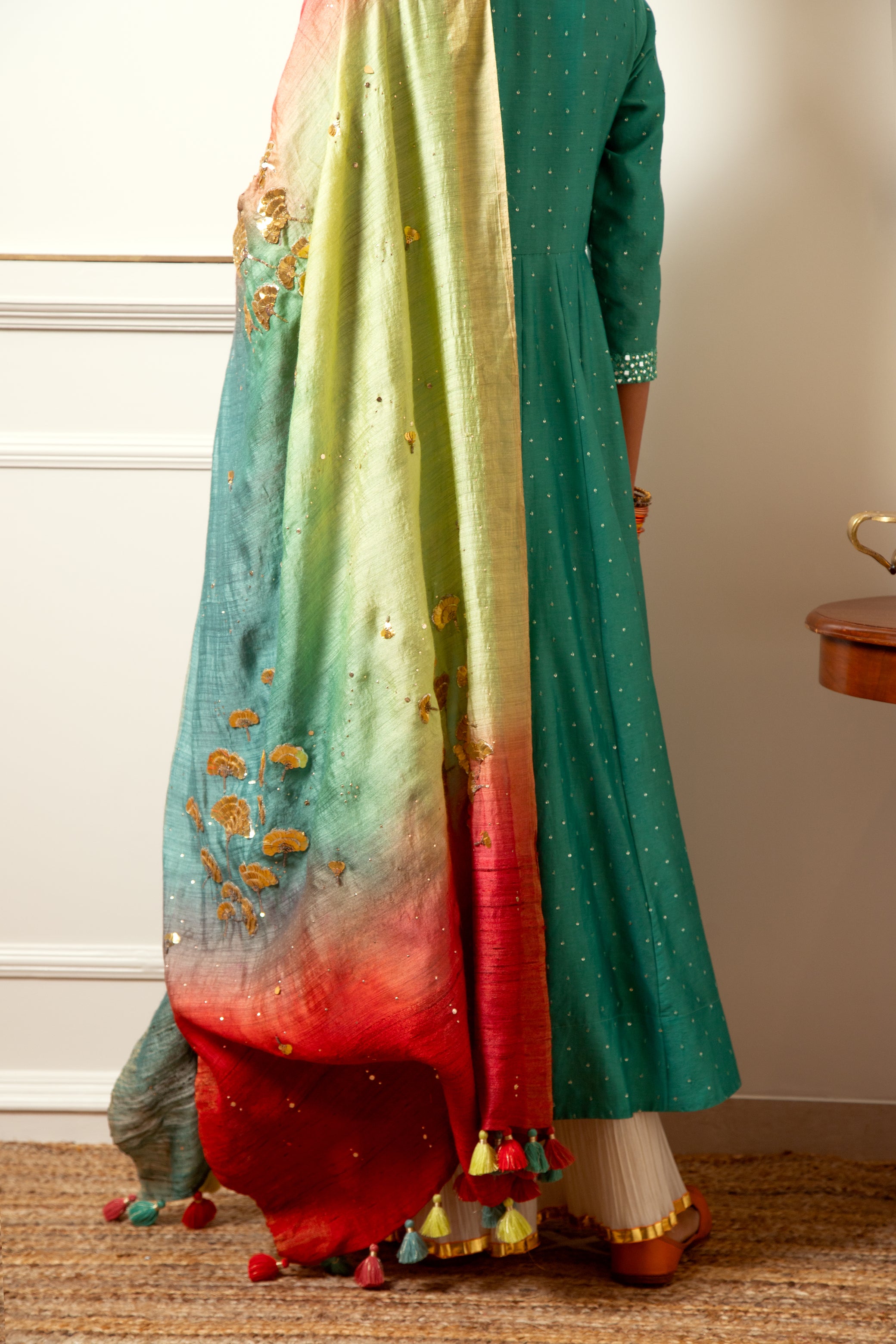 A 4D ombre dupatta in shades teal, pistachio, melon pink and coral.