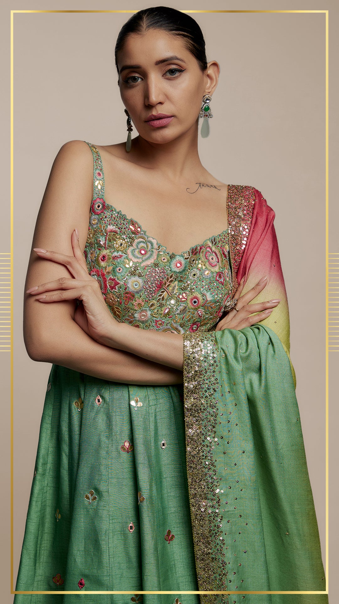 The 3D ombre dupatta in shades of teal, bright lime and melon pink is hand-embroidered with a shower of sequins along the borders.