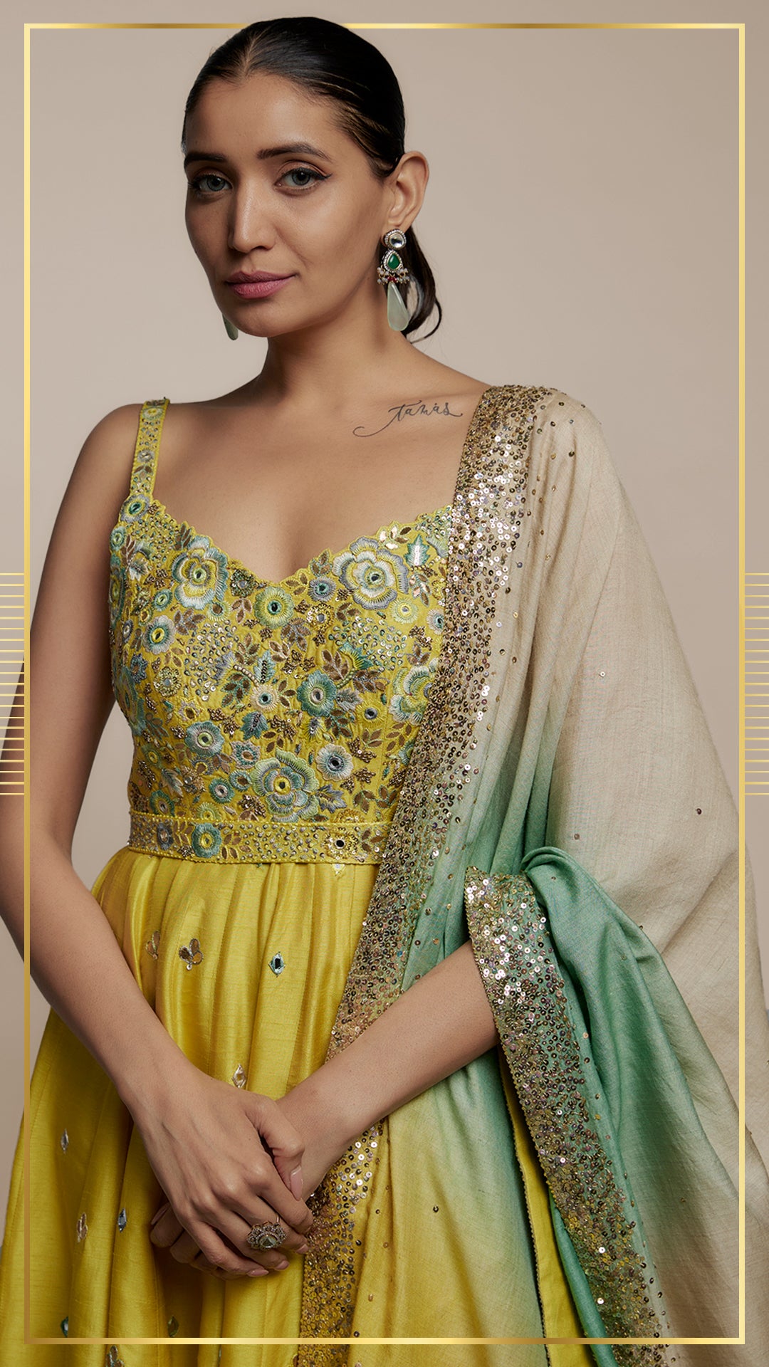 The 3D ombre dupatta in shades of teal, lime and ivory is hand-embroidered with a shower of sequins along the borders.
