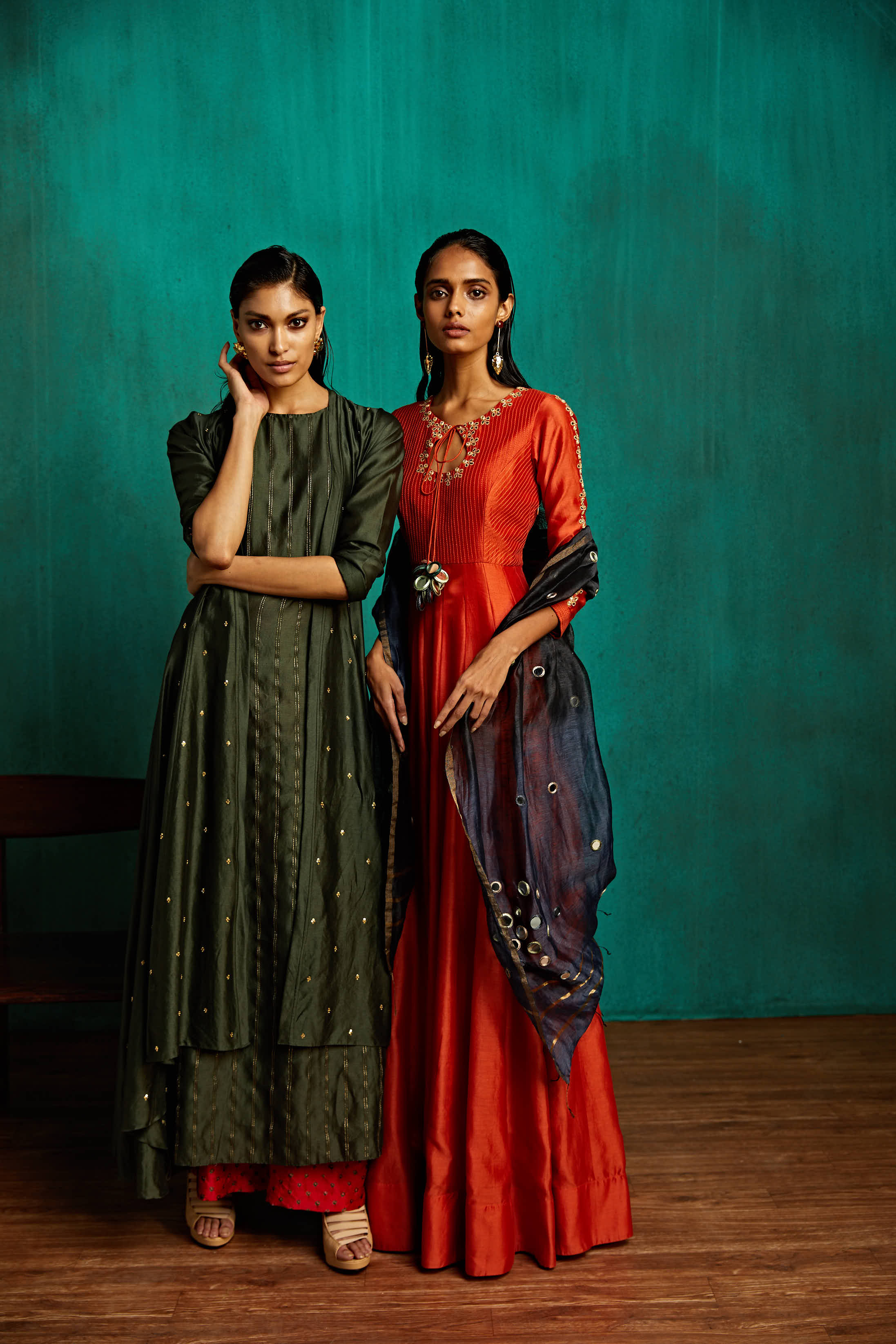 An easy to wear burnt orange chanderi silk floorlength anarkali. The yoke is textured with self threads and hand-embroidered with dainty gota and mirror-work accents around the neck.