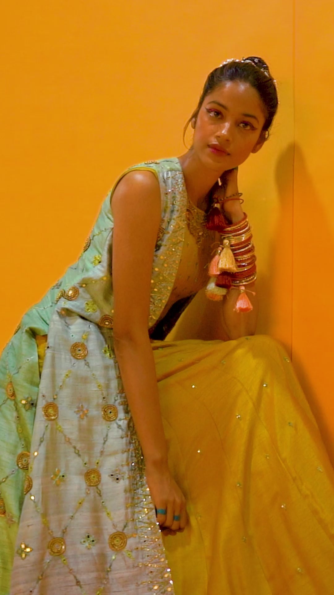 A mustard silk crop top textured with self and gold threads with a hand-embroidered neckline of sequins, zardozi & french knots.
