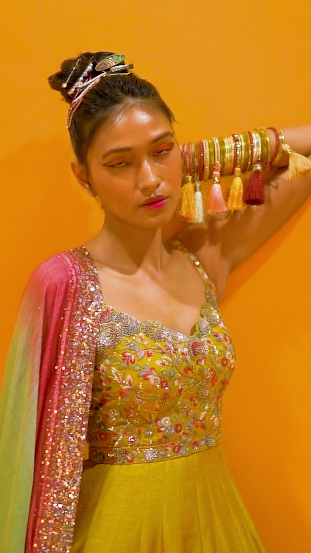 A signature ombre dupatta in shades of melon pink & pistachio lime is hand-embroidered with a shower of hand cut sequins and can be worn as an elegant shoulder drape or pleated at the shoulder & clinched at the waist with an embroidered belt.