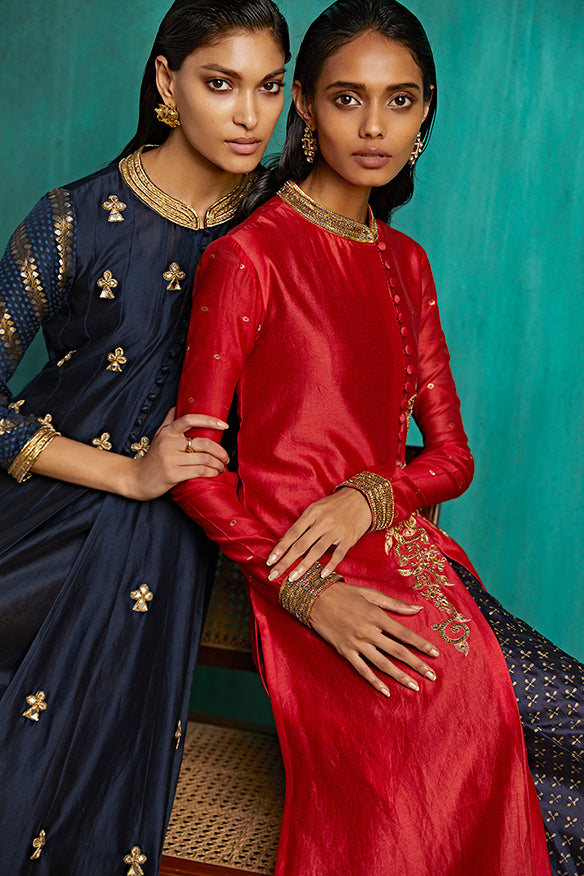 It has woven-zari sleeves & is hand-embroidered with our signature floral gotapatti and mirror-work motifs with hints of zardozi.
