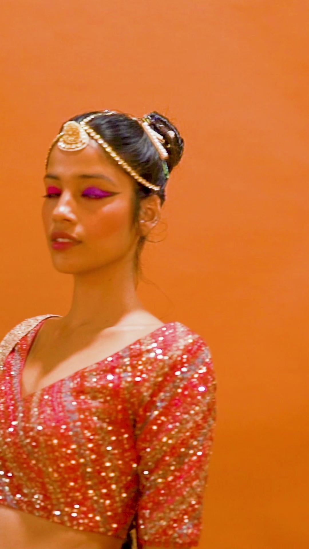 A bright orange silk lehenga, hand-embroidered with colourful thread zardozi motifs. The blouse is intricately hand-embroidered with sequins & colourful threadwork.