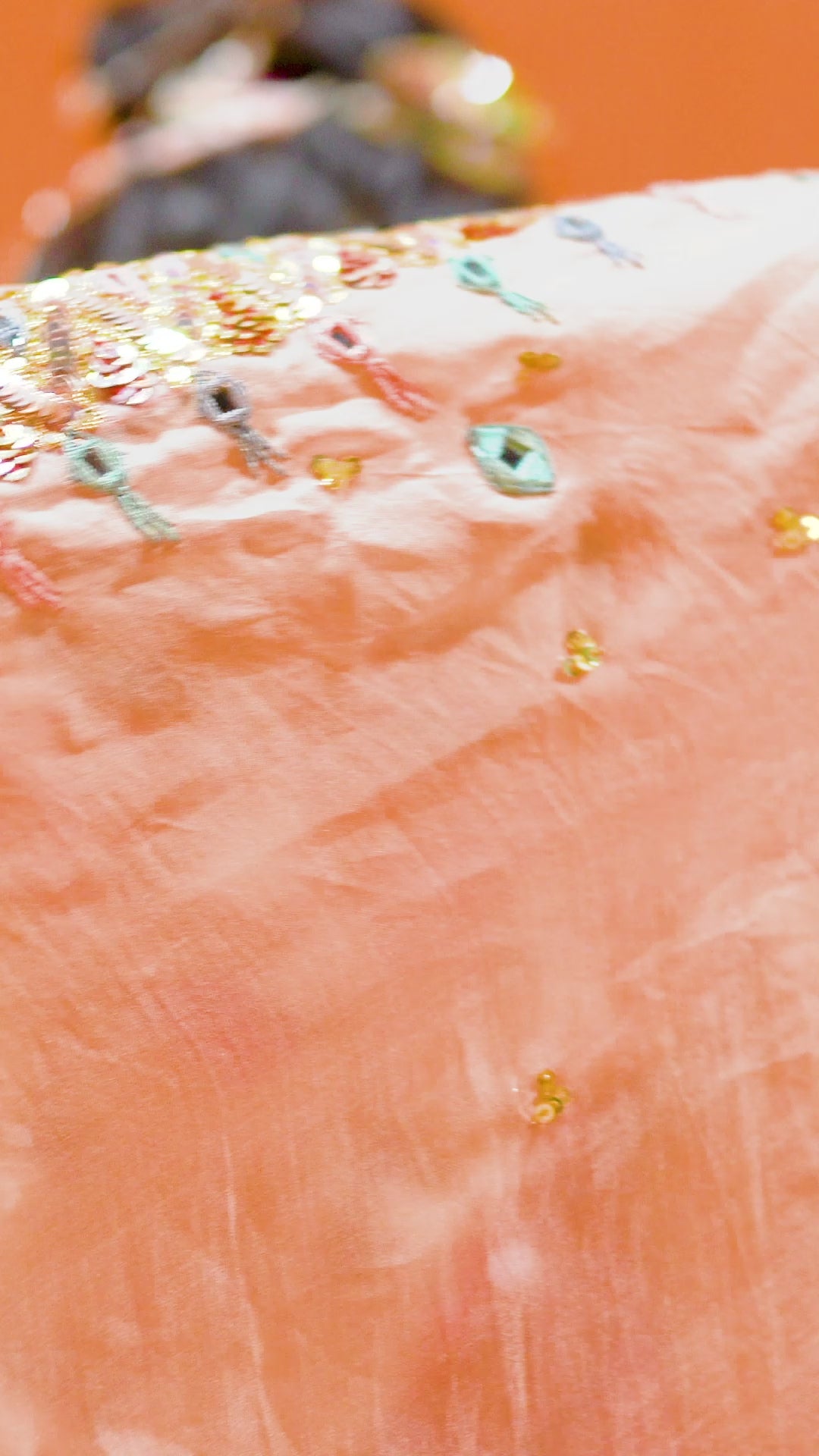 The sheer organza silk dupatta in shades of red, coral and blush pink is hand-embroidered with thread zardozi, mirror-work and sequinned knots.