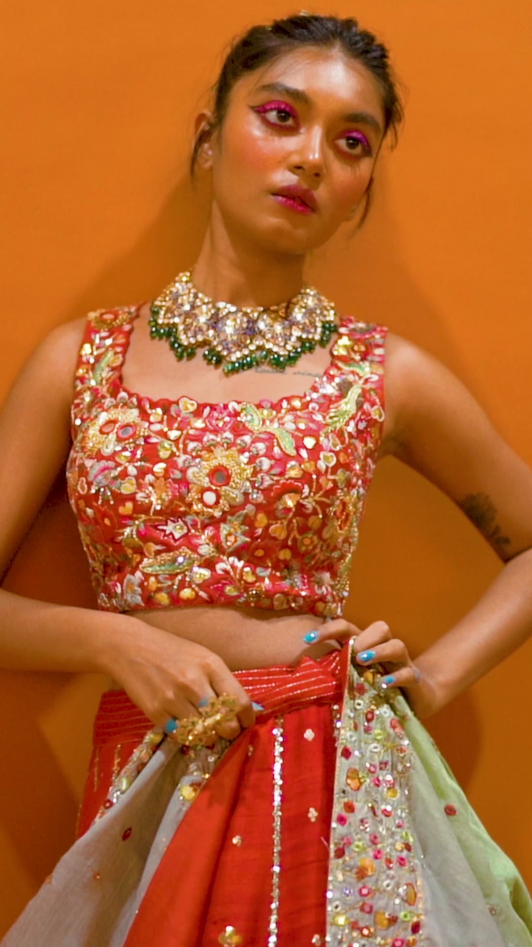 A silk coral orange lehenga, hand embroidered with clusters of our 3D signature petals in gotapatti as floral blooms adorning the ghera. The blouse features our 'BAGH' embroidery with floral blooms and birds in zardozi threadwork, mirror-work & gotapatti petals.