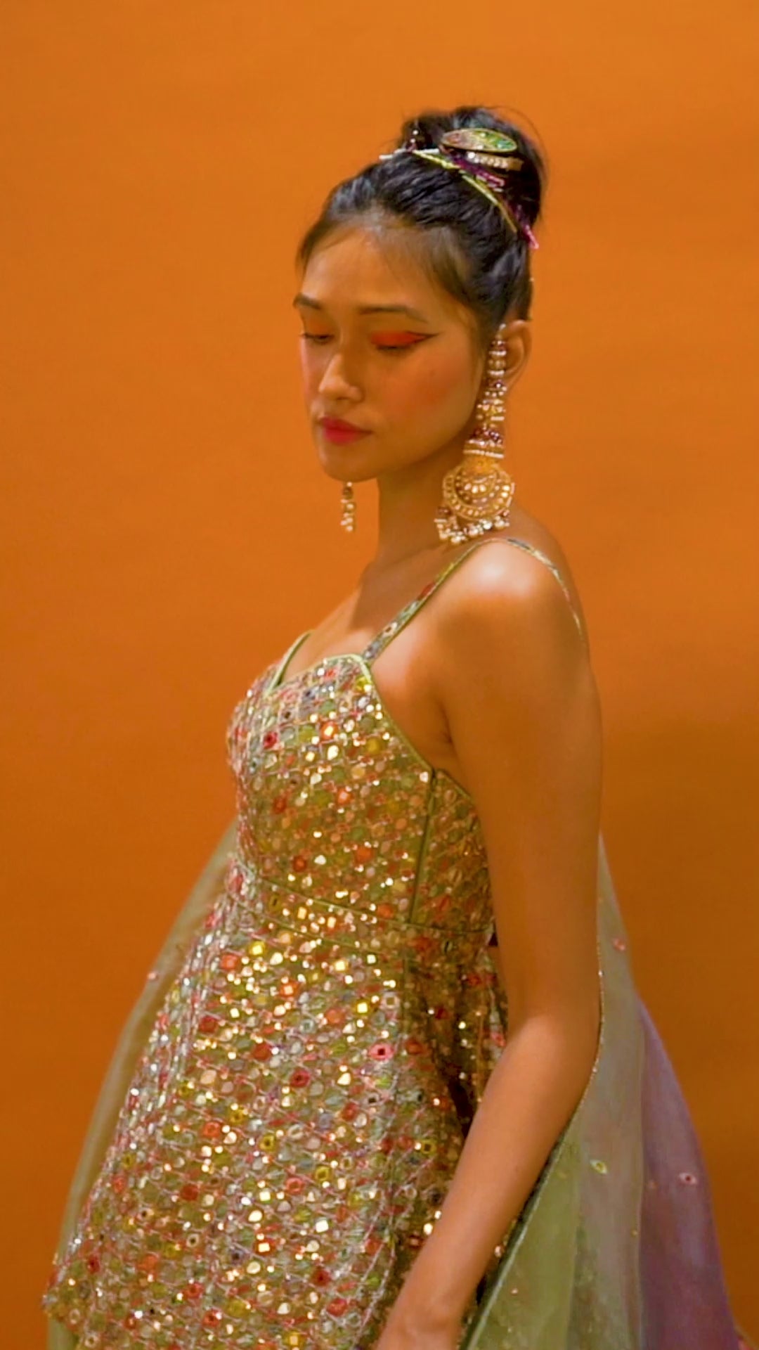 The tasseled sheer organza silk dupatta in shades of silver mauve, bright pistachio and melon pink is hand-embroidered with a sequinned mirror-work border.