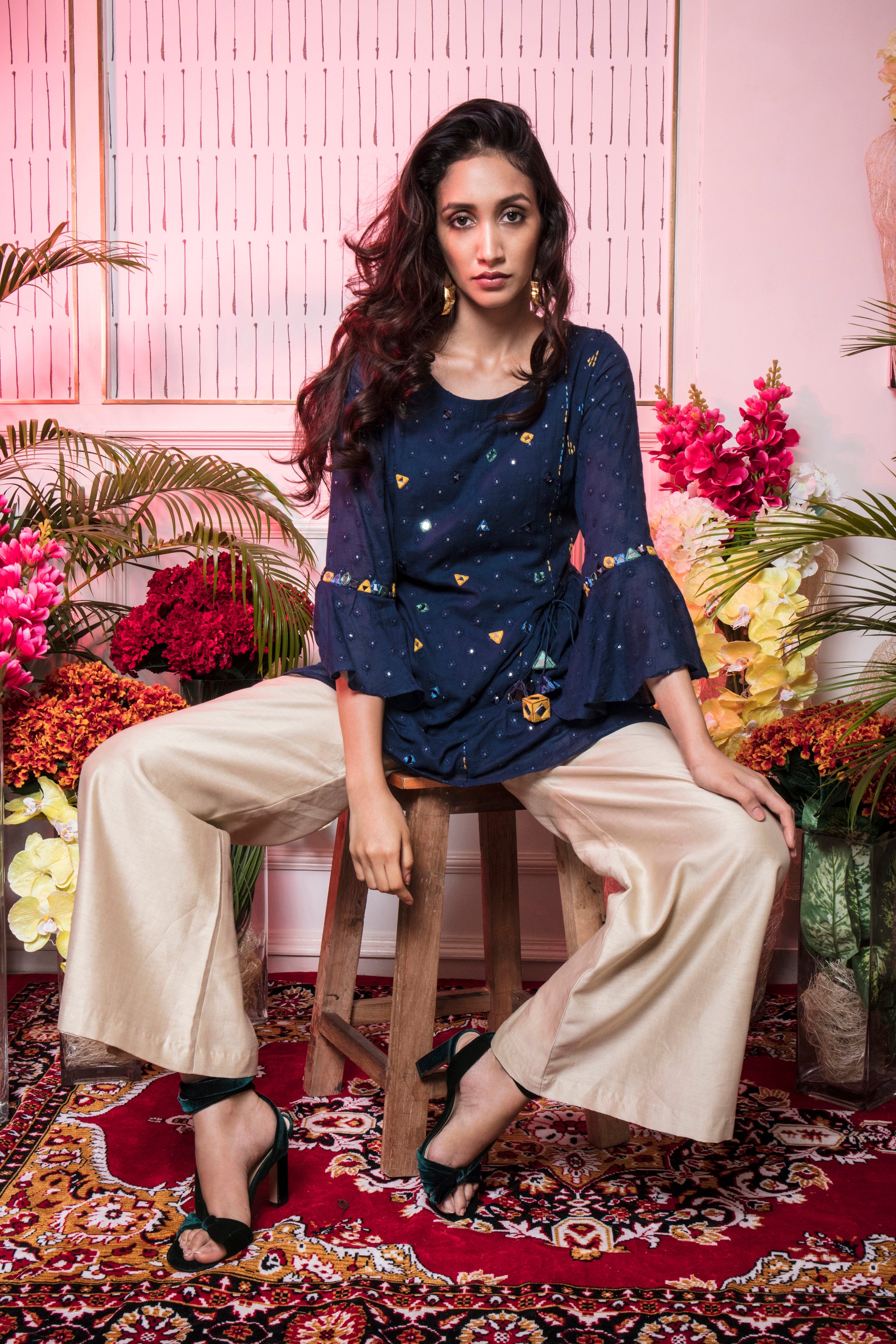 A midnight blue top with pleated panels + side tie-up with a bunch of tasseled mirror embellished accents. It is accentuated with geometrical mirrors in shades of pistachio, mustard, ivory & indigo.