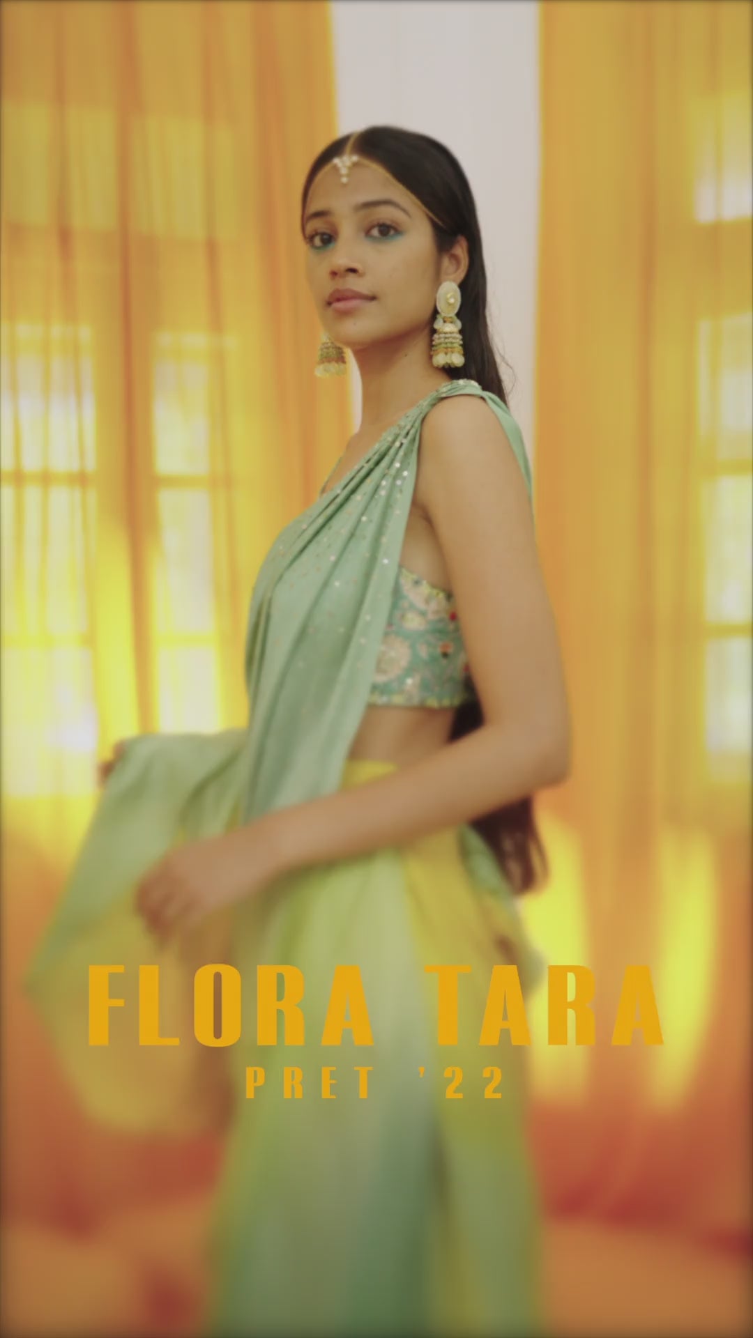 A jade green fauna block printed cold shoulder crop blouse embellished with colourful sequins and mirror-work. The saree is a pre-draped ombre pant saree in shades of teal, mustard and citrus lime.