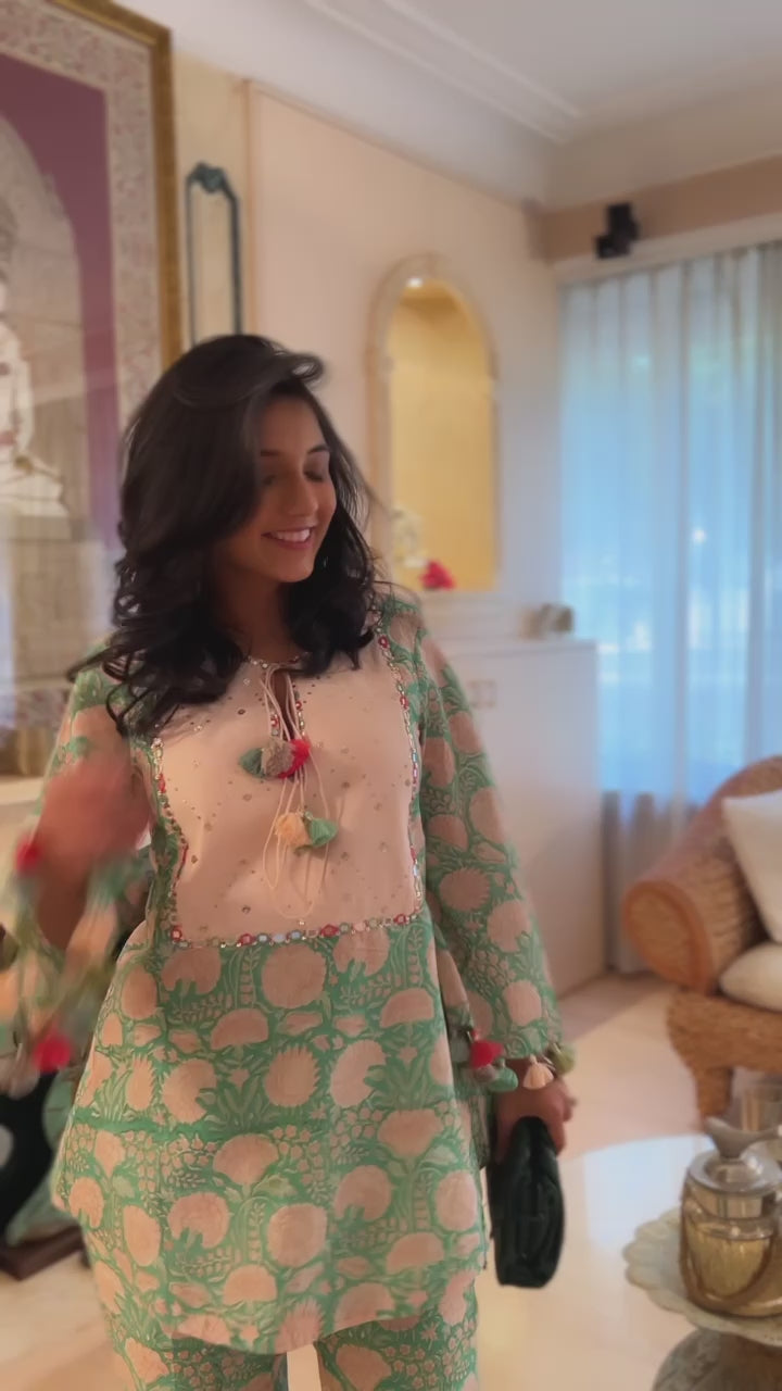 Our intermixed peach and mint green floral block printed co-ord set with coloured mirror work and sequinned + tasselled accents.