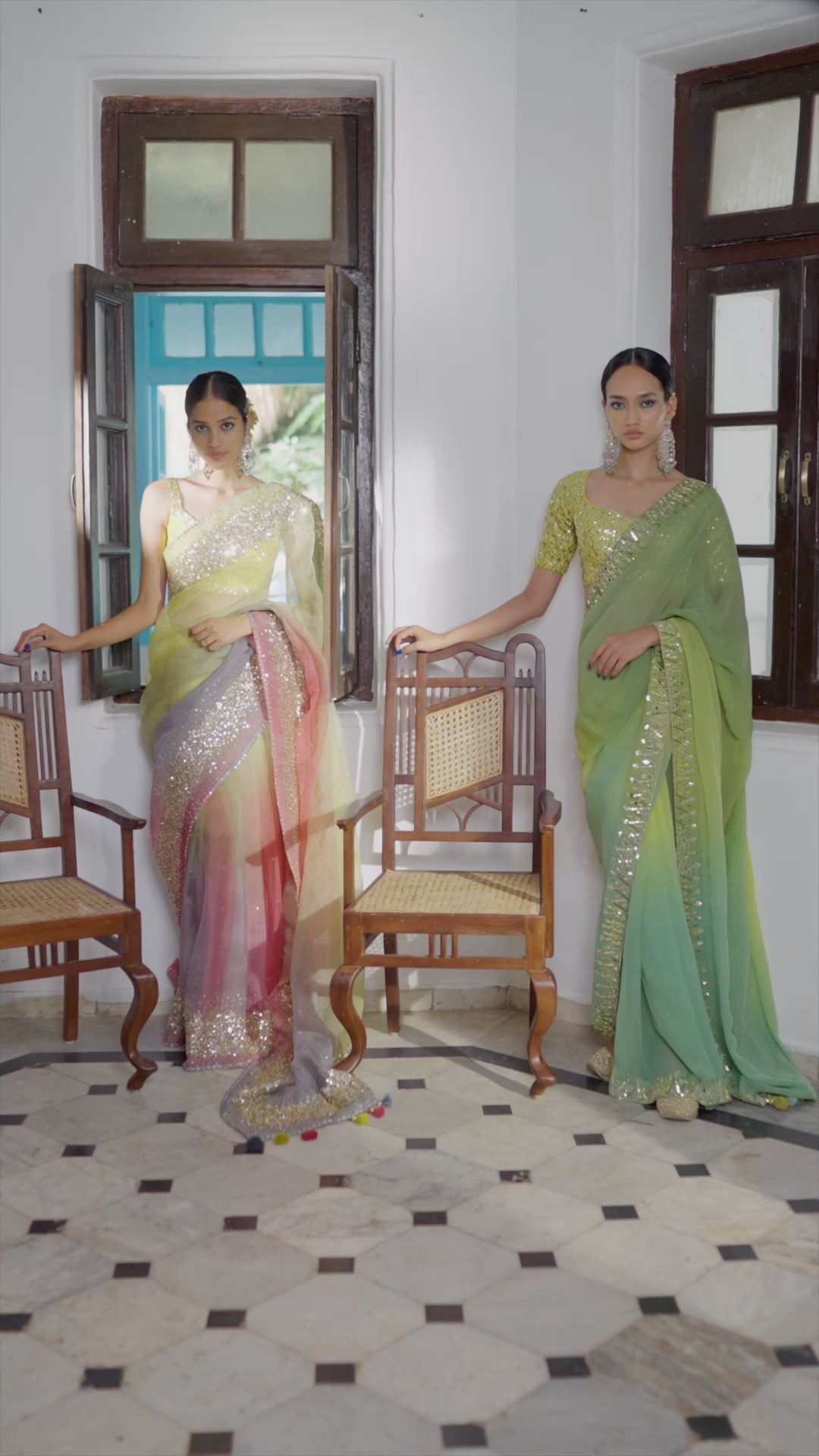 A sheer organza silk ombre saree, in shades of powder lime, pistachio, silver mauve and melon pink.